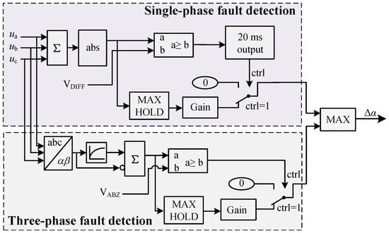CFPREV control, which is configured in the inverter station of LCC–HVDC, plays an important role in mitigating the risk of CF caused by AC faults. The schematic diagram of CFPREV control is shown in Figure 2, where ua, ub, and uc are the instantaneous phase voltage of the AC system, VDIFF and VABZ are the threshold of the single-phase fault and three-phase fault detection, respectively, MAX HOLD means holding the maximin, and ∆α is the output firing angle from CFPREV. As can be seen in Figure 2, the CFPREV control includes two parts, a single-phase fault detection module and a three-phase fault detection module [].