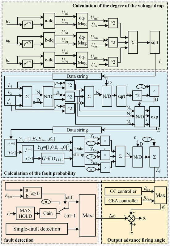 As depicted in Figure 4, the single-phase fault detection control remains unchanged from the traditional CFPREV control, while the three-phase fault detection control has been modified. In the modified three-phase fault detection control, the instantaneous values of the phase voltages ua, ub, and uc serve as the input quantities. These values are then utilized in Equations (4) to (13) to assign a probability of failure to each data point. Subsequently, the probabilities of failure are comprehensively considered for all the data points within the data window, which are then fed into Equations (14) to (15). Using Bayesian theory, the probability Ek of the existence of faulty data within the window is calculated. Ek expresses the existence of faulty data within the window. If Ek exceeds the reference value Epre, a fault is concluded to have occurred in the system, and an advanced firing angle command is rapidly sent to the LCC–HVDC inverter.