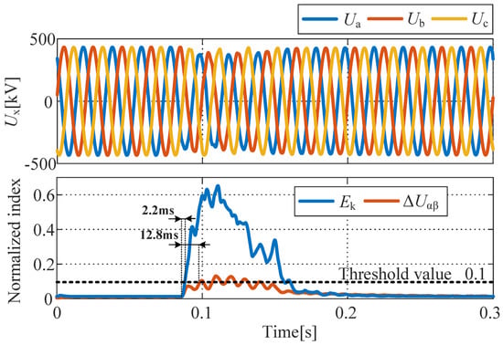 For three-phase fault detection, convert ua, ub, and uc to the rotation vector uαβ by Clark transformation. The expression of uαβ is given as follows:
