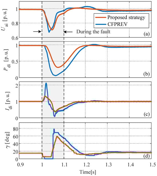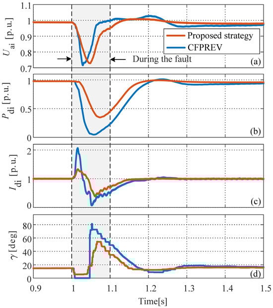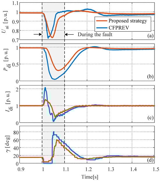 As can be seen in Figure 6, the AC voltage in the receiving end, Uai, drops rapidly after the fault occurs, with a fast decrease in γ. Thus, the risk of CF increases greatly. Under the traditional CFPREV, γ drops to zero, which means that CF occurs. Therefore, Idi surges to twice the rated value, and the DC transmission power at the inverter, Pdi, decreases rapidly. Under the proposed strategy, the converter can effectively realize the advanced trigger control, which raises γ from zero to 5.76° without an occurrence of CF. Meanwhile, the surge of Idi and the decrease in Pdi are also effectively suppressed.