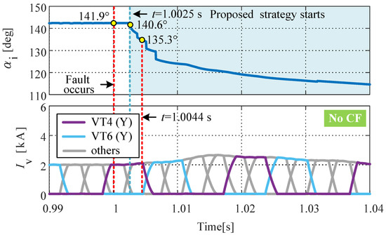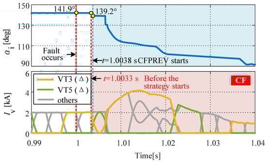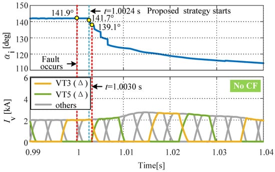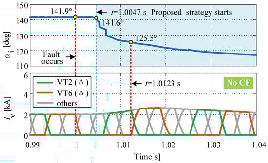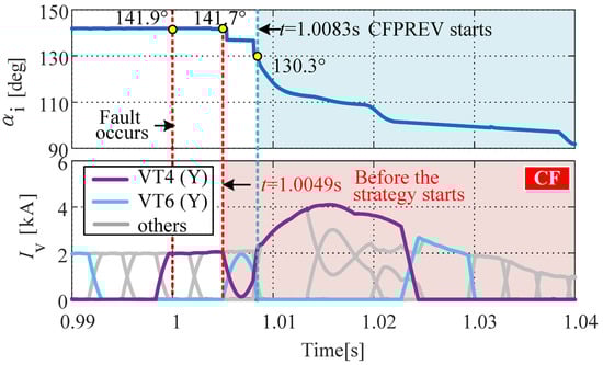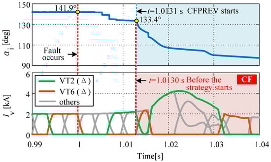 As can be seen in Figure 7, αi stays at 141.9° during the normal stage. After the fault occurrence and before the input of the traditional CFPREV, αi presents a step-like decrease by CEA control at the inverter []. The traditional CFPREV starts at 1.0131 s, by which time αi has dropped to 133.4°. However, a new commutation cycle from commutation valve 2 to valve 6 is triggered at 1.0130 s, which is earlier than the initiation of the traditional CFPREV. Consequently, despite the rapid decrease in αi after the strategy activation, it proves ineffective to intervene in this commutation, ultimately resulting in a failed commutation. Thus, the commutator valve 2 conducts again, with the occurrence of CF. In comparison, the proposed strategy starts at 1.0047 s, allowing for a faster decrease in αi, as shown in Figure 8. During the quick decrease in αi, the moment of commutation from valve 2 to valve 6 is advanced from 1.0131 s to 1.0123 s. This indicates that the proposed strategy can intervene effectively before the commutation event, ultimately resulting in a decrease in αi to 125.5°. Therefore, there is a sufficient commutation margin to prevent the occurrence of CF.