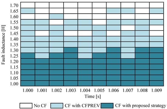 As shown in Figure 15, for severe faults with inductance values ranging from 1.00 H to 1.20 H, neither the traditional CFPREV nor the proposed strategy effectively mitigate the occurrence of CF. However, as the fault severity decreases within the range of 1.25 H–1.70 H, the proposed strategy proves more effective, successfully suppressing CF in most fault scenarios. In summary, out of the 150 simulated fault conditions, the proposed strategy effectively suppressed CF in 89 cases, compared to only 34 cases for the traditional CFPREV. Therefore, the proposed strategy exhibits superior CF suppression performance compared to traditional CFPREV.