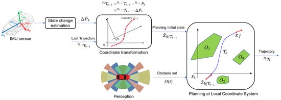 The diagram in Figure 3 illustrates the potential effect of the accumulated estimation error on the continuous trajectory planning results at timestep and the subsequent timestep . To clearly demonstrate the drift of the trajectory due to the estimation error, the trajectories and , planned in their respective local coordinate systems, are represented under the same global coordinate system, where the terminal destination is set to .
