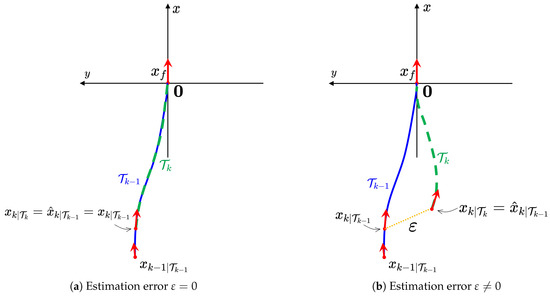 In the case of Figure 3a, when estimation error , . In this case, , used as the initial planning start state at time , has the following relationship: