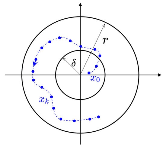 If is strictly decreasing in Prerequisite 1, for the system (17) along with Prerequisite 2, there exists , such that if , then . This means that the state will be contained in at some point, and its orbit will remain inside thereafter.