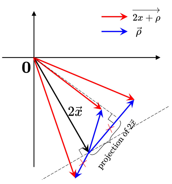 To satisfy , from Equation (22) the inner product of and have to be no greater than 0. Figure 5 shows the physical meaning of this in the Euclidean plane. It shows different possibilities of and how it affects the and, correspondingly, their inner product.