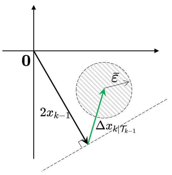 In Figure 6, the open ball of radius is shown in the grey shaded area atop the tip of . Then, the vector , i.e., the sum of and , is known to be confined in this shaded area. If for any that is bounded in , the condition (23) could be satisfied, then can be guaranteed.