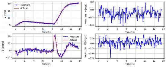 Figure 9 shows the change in the speed and yaw rate of the ego car during the moving traffic scene, as well as the measurement readings in the blue-cross line. The time plots of the measurement errors are also displayed in the right-hand subplots to show the deviation and noise of the sensor readings under the sensor noise settings in Table 1.