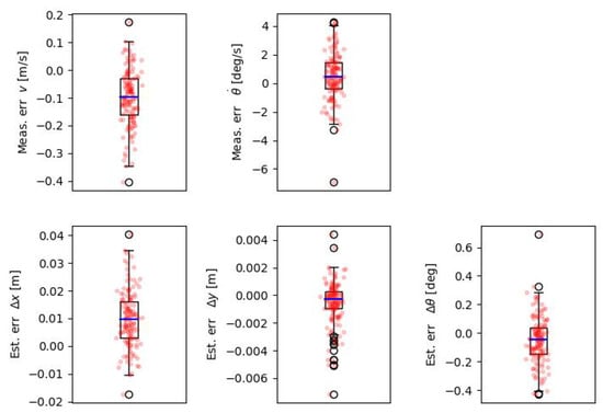 It is also examined how the measurement errors from the speed and yaw rate affect the relative motion estimate between the planning timesteps. In Figure 10, the top two plots shows the box plot as well as the scattering of the measurement errors. The bottom plots show how the above measurement errors, which resulted in the estimated errors in Equation (9) for the pose change between planning timesteps, i.e., , , and , under the local coordinate system.