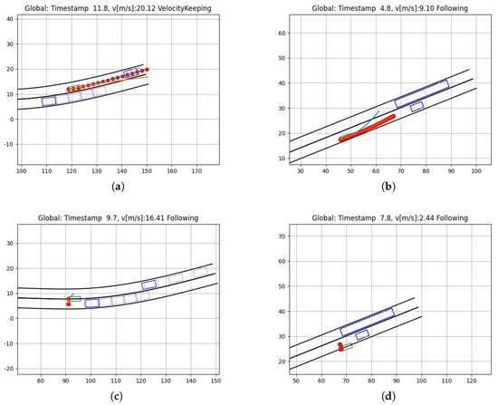 Figure 13 are time frames of the two scenes under yaw rate offset of 2.29 deg/s and 5.73 deg/s, respectively. At in Figure 13b, the ego car is not capable of centering itself in the middle of the lane and almost drives on the edge of the right lane compared to Figure 11. Considering that a yaw rate offset of 2.29 deg/s is already abnormally large, it shows that the proposed local planning framework is very robust in maintaining the stability of continuous planning. Under an even larger error in Figure 13c,d, the ego car drifts right so much that it eventually crosses over the lane bound and leads to a potential crash or fails in both scenarios.