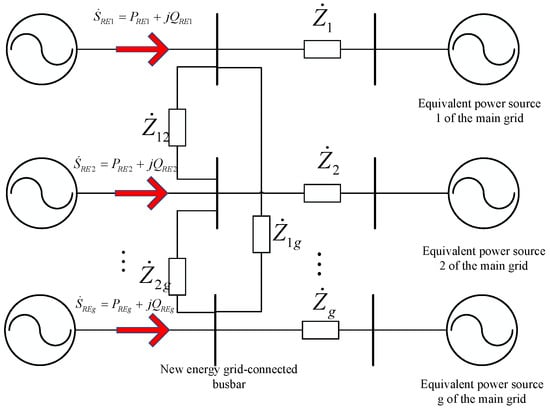 Figure 1 is a simplified model of an AC system connected with multiple renewable energy stations. In the figure, , , and represent the apparent power, active power, reactive power, and grid-connected busbar voltage of renewable energy generation station g, respectively. represents the equivalent impedance between the grid connection points g and j, and represents the equivalent system-side impedance between the equivalent power source g of the main grid and the corresponding grid connection point.