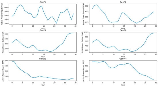 The output curve of a wind power plant is significantly influenced by weather conditions, particularly variations in wind speed and direction. Changes in wind speed directly affect the output power of the wind power plant, which can be described by the power curve. Generally, higher wind speeds result in higher output power, while lower wind speeds result in lower output power. Within a specific range of wind speeds (typically between the cut-in wind speed and the rated wind speed), the wind turbines can produce rated power. However, when the wind speed exceeds a certain limit (the cut-out wind speed), the wind turbines stop operating for protection, causing the output power to drop to zero. Under clear and cloudless conditions, wind speed is relatively stable, and the output power of the wind power plant fluctuates minimally. In cloudy and occasionally windy conditions, wind speed varies more, resulting in more significant fluctuations in output power. During storms or extreme weather conditions, wind speed fluctuates dramatically, leading to the highest fluctuations in output power and sometimes causing shutdowns if the cut-out wind speed is exceeded. This study uses a typical spring season as the verification scenario with a planning horizon of 240 h. The power generation data for a specific wind power plant are selected, and the output curves for the wind power plants on a certain day are shown in Figure 4 below. GenP1 corresponds to node 104, GenP2 to node 105, GenP5 to node 106, GenP6 to node 107, GenW3 to node 96, and GenW4 to node 97.