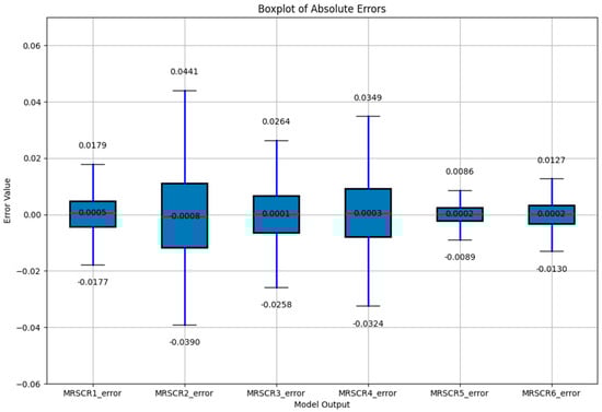 Based on the criterion of MRSCR > 1.5, we derived the constraints for the MRSCR. We randomly sampled 100 sets of data to fit Expressions (27) through (32) and another 1000 sets of data to calculate the formula results as the fitted values and compare them with the actual MRSCR values. The boxplot of the MRSCR fitting errors for the 6 wind farms is shown in the figure below.