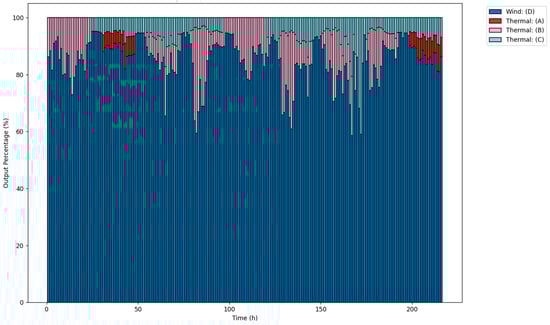 Stacked percentage output over time for wind and thermal generators.