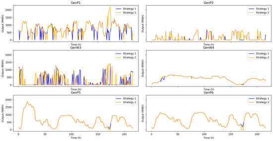 In Figure 9, the blue curve (strategy 1) represents the scheduling results of wind farm outputs considering the MRSCR constraint, while the yellow curve (strategy 2) represents the scheduling results without considering the MRSCR constraint. The figure shows that the MRSCR constraint limits the output of each wind farm to some extent, reducing output fluctuations and improving wind power quality.