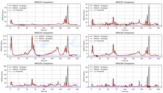 Similar to the figure, the black number represents strategy considered MRSCR constraint, the red number represents strategy neglect MRSCR constraint. MRSCR values below 1.5 are highlighted in yellow in the table. As shown in the table, the vertical coordinate of the black number is overall bigger: the smallest MRSCR at station1 of Strategy1 is 5.51, bigger than Strategy2’s 3.93; the smallest MRSCR at station2 of Strategy1 is 2.19, still bigger than Strategy2’s 1.77; the smallest MRSCR at station3 of Strategy1 is 3.85, bigger than Strategy2’s 2.99; the smallest MRSCR at Station 4 of Strategy1 is 4.62, bigger than Strategy2’s 3.28; the smallest MRSCR at Station 5 of Strategy1 is 8.06, bigger than Strategy2’s 2.72; and the smallest MRSCR at Station 6 of Strategy1 is 2.83. Meanwhile, Strategy2’s MRSCR has already dropped to the critical point of 1.5. At hour 170, the output of Wind Farm 6 without considering the MRSCR constraint reaches 1757.443 MW, with the MRSCR dropping to 1.39, below the standard of 1.5. However, the output of Wind Farm 6 considering the MRSCR constraint is reduced to 629.0049 MW, keeping the MRSCR above 3. The power deficit is compensated by thermal power units GenB1-1, GenB2-1, GenB2-2, and GenB2-3. An MRSCR value below the national standard of 1.5 will severely impact the integration of renewable energy into the grid, as a low MRSCR indicates insufficient voltage support capacity, leading to system oscillation and instability. The scheduling results considering the MRSCR constraint demonstrate superior performance in terms of this indicator.