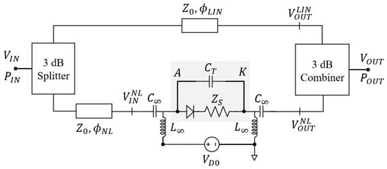 Let’s assume a power at the APD input, where is the peak RF voltage and is the characteristic impedance. This signal is split by a lossless perfectly matched 3 dB splitter that generates two in-phase signals at the input of the linear and nonlinear branches. The linear branch is modeled with an ideal lossless transmission line described by