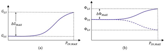 Ideal APD gain (a) and phase (b) vs. input power. Highlighted on the characteristics are the small-signal gain and phase ( and ), the large-signal gain and phase ( and ), maximum gain and phase variations ( and ) at the maximum input power .