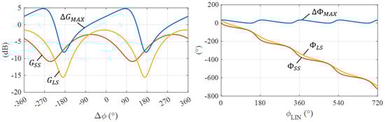 (Left) Small-signal gain , large-signal gain , and gain variation vs. phase difference . (Right) Small-signal phase , large-signal phase , and maximum phase variation vs. linear branch phase for a set .