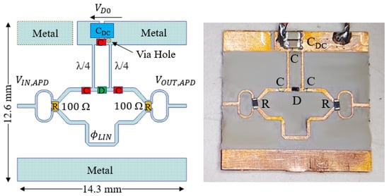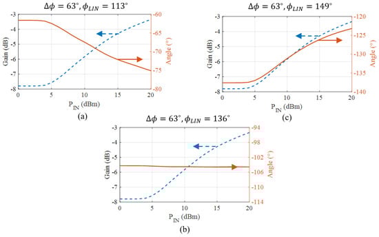 The theoretical phase characteristics of the proposed APD are shown in Figure 3b. Indicated on the diagram are the small-signal phase , the large-signal phase , and the maximum phase range . Please note that for high input powers, the diode generates harmonics that reduce the phase expansion at the fundamental (APD compression). The linear branch phase can be used to control the APD phase range. This is demonstrated using (17) to calculate the phase