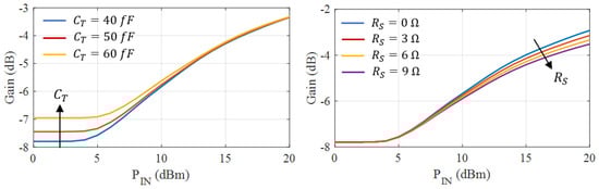 Figure 9 shows the APD model gain and phase response for the two diodes. Diode 1 has a wider amplitude expansion (1 dB more than Diode 2) and a wider phase variation ( more than Diode 2), mainly because of its lower total capacitance , as discussed in Section 2.3. The lower of Diode 2 provides a small improvement in the amplitude steepness at higher input powers that is insufficient to compensate for the higher .