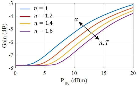 The theoretical gain characteristics of the proposed APD are shown in Figure 3a. Indicated on the diagram is the small-signal gain , the large-signal gain , and the maximum gain range . Please note that for high input powers, the diode generates harmonics that reduce the gain expansion at the fundamental (APD compression).