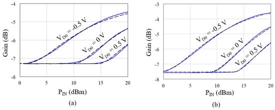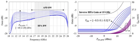 A large-signal setup based on the Keysight PNA-X and booster/driver amplifier (Keysight/HP 83020A) is used to characterize the APD with input powers up to 20 dBm. A bi-directional coupler is placed after the driver to sense the incident and reflected voltage waves at the APD input, and a 30 dB attenuator is used at the APD output to prevent accidental overdrive of the PNA-X receivers. Power calibration is performed at the APD reference planes across the bandwidth. Figure 19 shows the APD characteristics for V. These measurements confirm the simulated large-signal bandwidth of 6 GHz. The same large-signal setup is used to measure the APD characteristics at different biases and frequencies of Figure 8, which are used for APD model validation discussed in Section 2.6.
