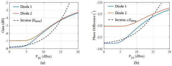 Inverted gain (a) and phase (b) of the HPA at 19 GHz. Superposed is the APD model response for Diodes 1 and 2. Diode 1 approximates the HPA characteristics on a wider range than Diode 2, thus suggesting higher linearity and efficiency improvements with this diode.