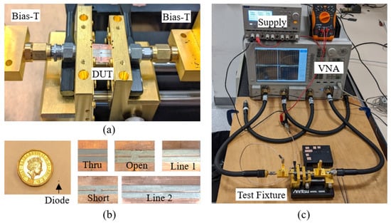A Thru-Reflect-Line (TRL) calibration kit based on the Rogers 3003 substrate is realized as shown in Figure 10b. For this kit, the frequency range is 1 to 26.5 GHz (upper-frequency limit of the VNA) and results in the requirements of two 90° lines. The first line is 15.8 mm long and is 90° at 3.07 GHz and covers the frequency range from 1 GHz (29.7°) and 5.15 GHz (152°). The second line is 3.1 mm long and is 90° at 15.8 GHz and covers the frequency range from 5.15 GHz (29.5°) to 26.5 GHz (152°). These lines, therefore, are within the 0–180° limit. A TRL de-embedding algorithm is then used to calibrate the A-K diode reference planes and remove the effects of the diode pads. Figure 10c shows the test setup used for this characterization.