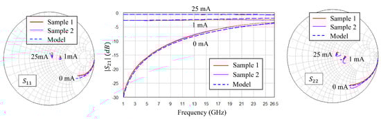 An Anritsu 3680K test fixture is utilized to provide 2.92 mm connectors to the diode fixture, as shown in Figure 10a. The diode bias is applied with two bias-Ts (HP 11612A, Keysight Technologies, Santa Rosa, CA, USA). The anode bias-T provides a positive or negative bias, while the cathode bias-T provides a ground connection. These bias-Ts are connected to a 26.5 GHz PNA-X (Keysight N5242A, Keysight Technologies, Santa Rosa, CA, USA).