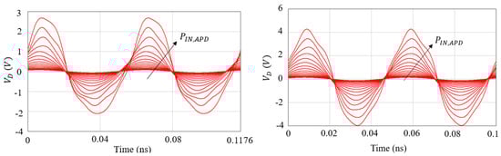 As anticipated previously, the phase difference determines the APD gain range, and this is demonstrated analytically as follows. Let’s assume fF and , the nonlinear branch output voltage (8) reduces to