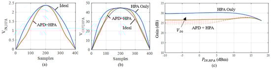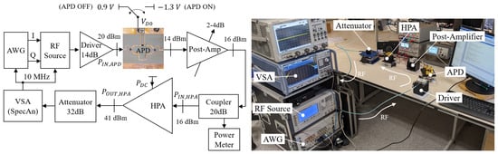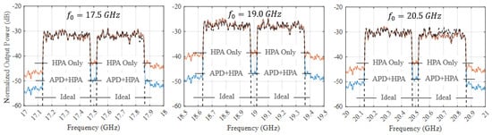 Depending on the carrier frequency, the APD attenuates by 5–6 dB when the APD input power is 20 dBm, Figure 19. To recover this loss, a post-amplifier (variable attenuator + Mini-Circuits ZVM-273HP+) is introduced to restore the HPA drive of 16 dBm. This power is sensed by a power meter connected to a coupler at the HPA input. The signal is then amplified by the HPA up to 41 dBm. A 32 dB attenuator is connected between the HPA and a vector signal analyzer (VSA, Rohde & Schwartz FSW43, Munich, Germany) with 1.2 GHz bandwidth.