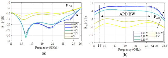 Using the Keysight PNA-X vector network analyzer N5242A of Figure 10c, the S-parameters of the APD circuits were first measured for different diode biases, and result in Figure 18. A positive diode bias was used to simulate the diode turn-on that is caused by the RF input power, and so verify the correct APD operation. As shown by Figure 18, the APD input improves from about −7 to −15 dB as the diode is turned on. Thanks to the input Wilkinson divider, an acceptable input match is maintained even when the diode is off, thus avoiding the need to introduce bulky and bandwidth-limiting isolators.