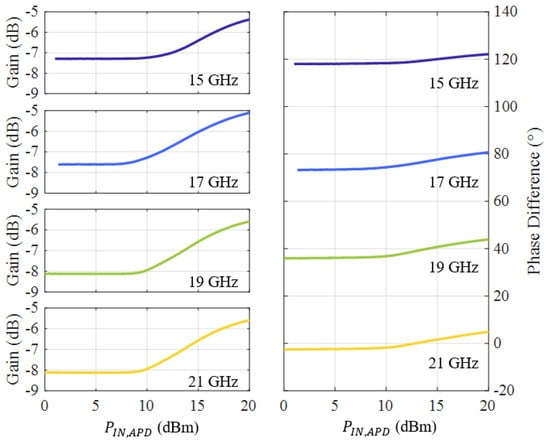 The next step is finding the diode bias voltages that ensure maximum gain and phase flatness. This is achieved by sweeping the diode biases with a narrowband Gaussian pulse [22] at 19 GHz, as shown in Figure 21. As the diode bias becomes more negative, the APD+HPA combined response starts to flatten in the backoff region and then reaches the compression where APD expansion and HPA compression cancel out, thus realizing an extended linear power range. As shown in Figure 21, for V the APD+HPA presents less than 2 dB compression for the same output power whereas when the APD is not used, the compression is over 6 dB. Similar results can be found for the phase where the APD reduces the variation by 5° ( without APD and with APD). This tuning has also been performed for each of the three considered frequencies and results in V for GHz.