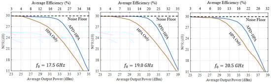 As the DC power consumed by the APD block is practically zero (there is a small rectified current by the diode, which is, however, less than a few mA on average), the main power consumption caused by APD is due to the post-amplifier, . Assuming a driver stage of [25] which achieves 21 dBm output power (OIP3 of 33 dBm) and draws 0.7 W, Table 2 reports the estimated efficiency, including the driver stage. For NPRs of 28, 24, and 20 dB, the introduction of the post-amplifier reduces the APD+HPA efficiency by only about 1–2%, thus suggesting the viability of APD for overall efficiency and power increase for this HPA.
