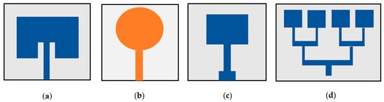 Different MPAs: (a) rectangular with inset feed, (b) circular patch with microstrip line feed, (c) rectangular patch with quarter-wave transformer, and (d) rectangular patch arranged in an array with tapered line feed.