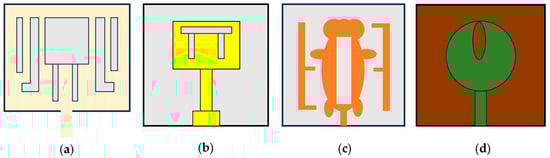 MPA with (a) L- and I-shaped slots, (b) π-shaped slot, (c) Dolly-shaped slot, and (d) elliptical-shaped slot.