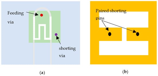 Numerous studies have been published in the scientific literature that describe the development and assessment of MPAs implementing shorting pin procedures [20,27,33,34,36]. For the high-frequency design of the planar inverted-F antenna (PIFA) antenna, the shorting pin needs to be positioned toward the corner or edge for optimal gain [37]. The addition of a metallic cylinder, or shorting pin, increases the inductance of the PIFA antenna by a factor of , where is the reactance that the shorting pin produces. It shifts to the higher side in frequency due to inductive loading. In [20], the resonant frequency is produced on the substrate-integrated waveguide (SIW) antenna by the inductive loading of two metalized shorting pins. The electromagnetic energies are combined with the radiating patch via a narrow slot in an SIW transmission line. There are two metalized shorting pins on either side of the transverse slot that link the patch to the top metallization surface of the SIW transmission line, as displayed in Figure 5.