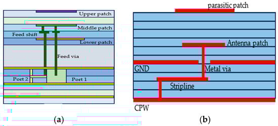 Three-layered patches are used in [36] to accomplish dual-band functioning. As illustrated in Figure 6, the center patch couple feeds the large lower patch used to achieve the lower band. The middle and top patches are used to generate the upper band. A shorting pin that connects the lower patch to the ground is utilized to improve polarization isolation in the bottom band. The location of the vertical feeding probe in between the mid-patch and bottom patch is altered to a slight extent, utilizing the benefits of multi-layer technology to achieve appropriate matching of impedance in both the top and bottom bands. The antenna-in-package (AiP) consists of one central core layer (CCL) and the prepags (PPGs). Three broad layers make up the antenna-in-package structure: five layers of PPGs on top, five layers of PPGs below, and a CCL layer in the middle. Different layers have different dielectric constants. Various configurations based on the idea of stacked patches have been researched and suggested in [38,39,40].