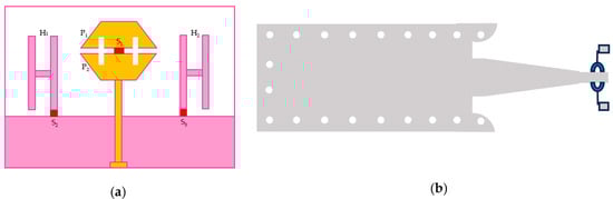 A hybrid reconfigurable antenna is fabricated in [40] to recompose antenna characteristics, e.g., frequency and radiation patterns. The reconfiguration characteristics are tracked using PIN diodes, which act like switches. The antenna consists of three switches (S1, S2, and S3). Its main beam is controlled by S1 and S2, which connect parasitic stubs H1 and H2, and S3, which connect patches P1 and P2. These three parts keep the frequency between 28 and 38 GHz. In [41], a frequency reconfigurable SIW antenna is proposed where two PIN diodes are used as switches; turning one of the two diodes on or off can alter the resonance frequency. The microstrip feed thread resembles the tendrils of a plant with a pair of PIN diodes connected at both ends of the rectangular coil, as depicted in Figure 7. Another T-shaped coplanar waveguide (CPW)-fed frequency reconfigurable antenna is exhibited in [42], where two variable resistors are used for frequency variation. In [43], a different type of reconfigurable antenna is suggested. It consists of a split-ring resonator surrounding a hexagonal patch with four different operation modes when two PIN diodes are used.