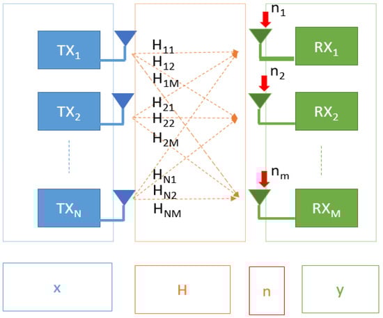 We examine a system having N transmitting antennas and M receiving antennas, in which every antenna on both sides can communicate with each antenna on the other side. This results in N × M communication channels. Noise is considered for each receiving antenna. The transmitting symbols are generated using quadrature amplitude modulation of constellation size 16 (16-QAM) [6,7]. System performance is evaluated within a signal-to-noise ratio (SNR) range of 0 to 20 dB, with 5 dB step size. Figure 2 illustrates the general model for a MIMO system containing M receiving antennas and N transmitting antennas, which includes transmitted signal vector (x), received signal vector (y), channel matrix vector (H), and noise vector (n) [8]. The proposed system’s development is based on the following equation: