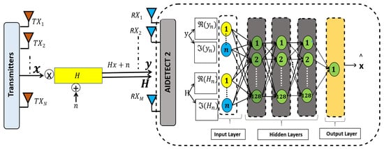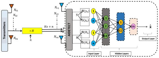 Algorithms based on mathematical models encounter several limitations, such as limited scalability and high complexity [20]. To avoid these issues and enhance the utilization of MIMO systems present in wireless communications, incorporating AI-based methods, such as ML, offers a promising solution. ML algorithms can indeed be beneficial in the development of ultra-reliable and low-latency communication (URLLC) networks [21]. By optimizing channel allocation based on traffic patterns, AI can significantly improve overall spectral efficiency and network performance. The primary goal here is to develop an AI-enhanced signal detection model for MIMO systems in wireless communication. Instead of traditional detection methods, we designed a neural network method to detect the transmitted signal. Following the development of the neural network, we trained it utilizing multiple transmitted symbols and subsequently evaluated the system’s performance with various symbols. The efficiency of the developed system needs to be contrasted with that of conventional methods and other AI models.