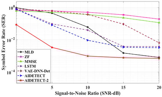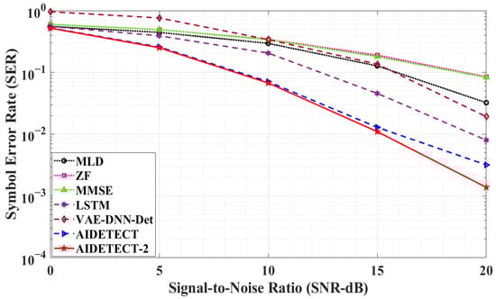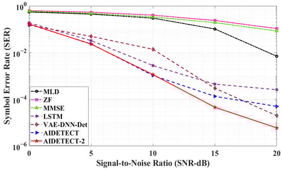 Finally, in our last simulation scenario, we considered a bigger scenario of an 8 × 8 MIMO system with 8 transmitting and 8 receiving antennas as shown in Figure 8. Similar to Figure 6, Figure 7 and Figure 8 also follows a similar trend showing the superiority of the proposed AIDETECT-2 against the benchmark conventional and AI-based MIMO detectors. Figure 8 results show that at 20 dB SNR, the proposed AIDETECT-2 achieves 99.4% to 99.7% better SER performance than conventional ZF and MMSE MIMO detectors. However, for a bit large 8 × 8 MIMO scenario, the optimal MLD MIMO detector achieves better SER performance than other AI-based MIMO detectors and holds very close SER performance (13.75% lower SER) than AIDETECT-2 at 20 dB SNR, but is still unable to beat the proposed AIDETECT-2 MIMO detection method. Figure 8 simulation results also show that the proposed AIDETECT-2 outperforms the benchmark AI-based MIMO detectors including AIDETECT and achieves between 78.5% to 89.2% better SER performance than all AI-based MIMO detectors at 20 dB SNR respectively.