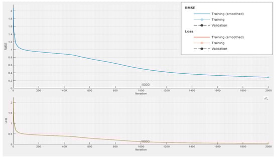 We also analyze the training and validation graph based on root mean square error (RMSE) and loss for 8 × 8 MIMO system mode. Figure 9 shows the plotting of both loss and RMSE against the number of iterations in the model training and validation process. Figure 9 demonstrates how, as a result of the initial randomness of the model, RMSE begins high and rapidly drops in the first 200–300 iterations as the model learns, then steadily drops throughout fine-tuning. With a somewhat larger, steady value, the validation RMSE closely tracks the training RMSE, suggesting little overfitting and strong generalization.