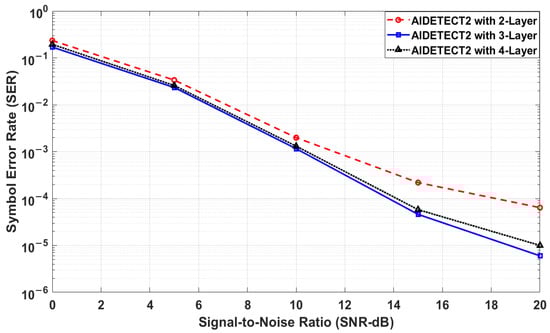 Furthermore, we also conducted an optimization study aimed at improving the performance of the proposed AIDETECT-2 network model based on the number of hidden layers for a 4 × 4 MIMO system focusing specifically on the proposed model’s neural network architecture. The study involved evaluating the model’s performance with varying numbers of hidden layers, specifically 2, 3, and 4 hidden layers as shown in Figure 10. Through experimentation and analysis, it was observed that AIDETECT-2 with 3 hidden layer model consistently outperformed both AIDETECT-2 with 2 hidden layer and AIDETECT-2 with 4 hidden layer configurations across key performance metrics. Consequently, the AIDETECT-2 network model based on FFNN with 3 hidden layers was selected as the optimal architecture for the proposed signal detection model. This decision was based on its superior ability to handle the complexity of MIMO systems, achieve higher detection accuracy, and maintain computational efficiency. The findings underscore the critical role of architectural design in optimizing neural network models for practical applications in communication systems.