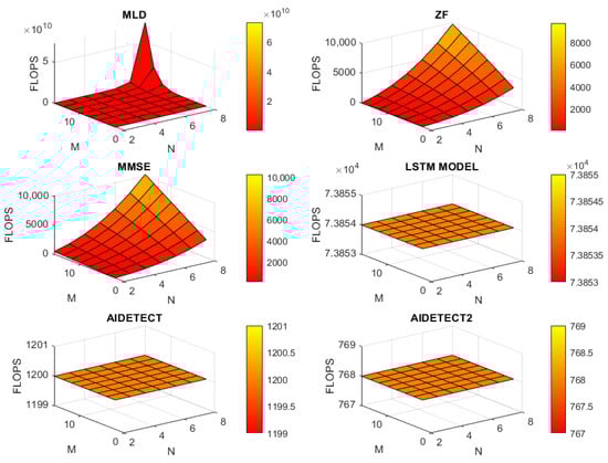 Computational complexity is an important parameter to measure the effectiveness of any MIMO detector. The complexity analysis is required to comprehend standard MIMO detectors’ computational computing needs. In this section, we further analyze the computational complexity of different conventional (MMSE, ZF, and MLD) and AI-based (LSTM, VAE-DNN Det, AIDETECT, and AIDETECT-2) MIMO detectors respectively as presented in Table 3. The computational complexity of the proposed model on comparison with other model is plotted in Figure 11 in the form of number flops. Flop is the measure of number of floating point operations per second [25,26]. Where M is the number of receiving antennas and N is the transmitting antennas.