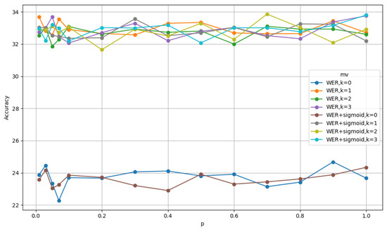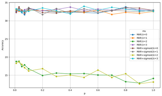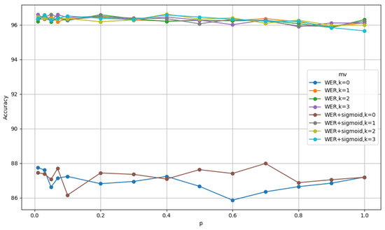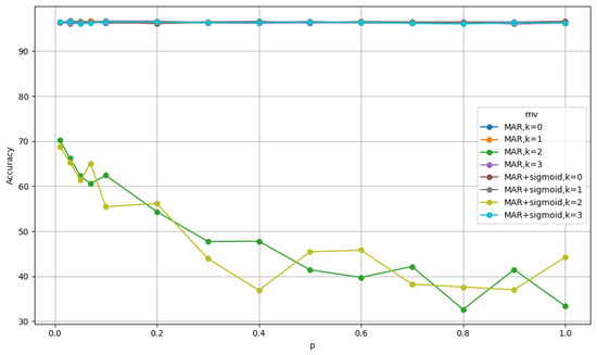 Similarly, we also use the values for k and p that give the highest accuracy. For the MNIST dataset, when considering MAR, the best accuracy is obtained when and . For MAR with sigmoid, the best accuracy is obtained when and . Similarly, for WER the best accuracy is obtained when and and for WER with sigmoid, by setting and gives the best accuracy.