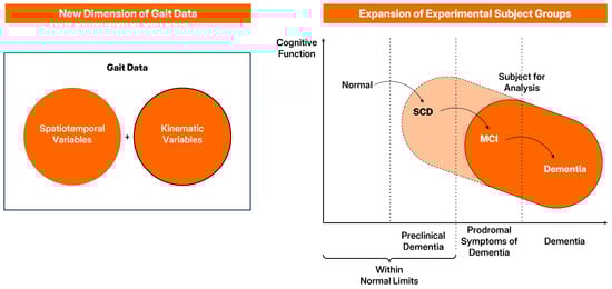 Existing clinical tools for measuring natural gait functions include timed up and go (TUG), comfortable gait speed (CGS), and Tinetti tests. The TUG test is a gait assessment method commonly used in clinics to identify gait impairment. It is applied to cognitively impaired patients with diseases such as Parkinson’s disease and frail elderly individuals [,,]. The CGS test is used to assess gait speed in a manner that is most comfortable and natural for an examinee; it involves walking a distance ranging from 2–10 m [,]. The Tinetti test for gait assessment utilizes a scoring approach predicated on the accumulation of scores for detailed gait components. These components include initial hesitancy in the gait phase, stride length, height, and continuity within a gait cycle, in addition to deviations from the path, the use of walking aids, or walking posture. The probability of falling among the elderly is determined by the total scores and the balancing test results. Current assessment methods solely consider the duration of time spent walking. Furthermore, gait analysis or diagnosis depends on an examiner’s subjective evaluation of the variability in stride speed or length. For evaluating cognitive functions, recent research on gait has used various sensors and devices to measure and evaluate diverse gait variables (including those imperceptible or those other than gait speed) precisely. Moreover, research has been extended to include the SCD group in addition to the MCI group (the primary subjective group considered in previous studies). This trend in the field of gait research is visually demonstrated in Figure 2.