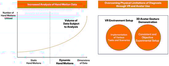 Recent studies on hand movements leverage various gestures that are challenging to interpret. These movements include dynamic gestures or relatively complicated hand motions involving tracing trajectories in 3D space (such as those in games or sign language). The accumulation of complex and multiple behavioral data indicates that the volume of information for analysis is increasing. Moreover, some studies have circumvented the physical constraints in experimental environments using VR and 3D avatars to maintain the consistency of experiments. The trend in hand movement research is depicted in Figure 3.