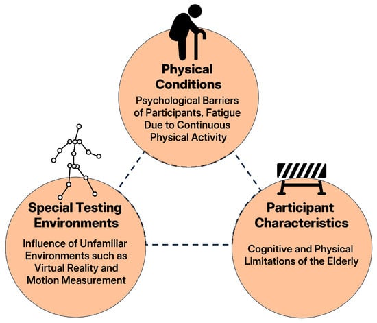 A study in 2022, “Gait Speed and Sleep Duration Is Associated” [], investigated the relationship between the gait speed and sleeping hours of the elderly. In that study, the researchers accompanied the examinees as they walked on every path during the gait test to ensure safety. Second, the effects of everyday situations and varying experimental environments must also be considered in the UX aspect. In particular, unfamiliar experimental environments (e.g., VR or 3D motion measurement) can induce atypical or unnatural behavior among elderly participants. In terms of a diagnosis using VR, caution is necessary to prevent side effects (e.g., psychological burdens, inability to use the device, and dizziness in the VR environment). Third, the circumstances in cognitive examinations must be considered. An examinee’s resistance or psychological load during cognitive tests can also affect examination results. Continuous and repetitive data assessment is required for the accurate scoring and tracking of cognitive state. However, regular visits to a hospital, examination facility, or laboratory are challenging for the elderly. Strategies reducing the examinee’s physical and psychological barriers to improve examination accessibility are necessary. Lastly, an examiner’s inconsistencies in providing experiment instructions and scoring results, the effect of repetitive assessment on the examinee in terms of learning, the variability of the examinee’s ability to use systems and situational characteristics must all be considered in the UX aspect.